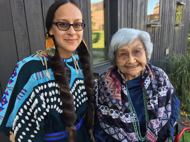 Photo: Dr. Jacob and Dr. Beavert all dressed up ready to go to the Many Nations Longhouse at the University of Oregon